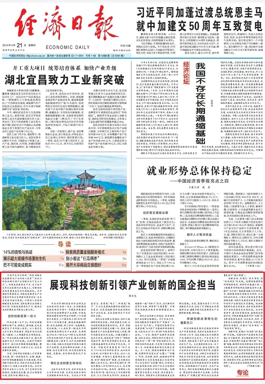 4月21日,《經濟日報》一版刊發中國建材集團黨委書記、董事長周育先的專論,文章圍繞“加快發展新質生產力”展開論述,闡述堅持創新是第一動力,更好發揮企業創新主體作用,努力突破創新成果轉化的重要關口。下面一起來看詳細內容~
