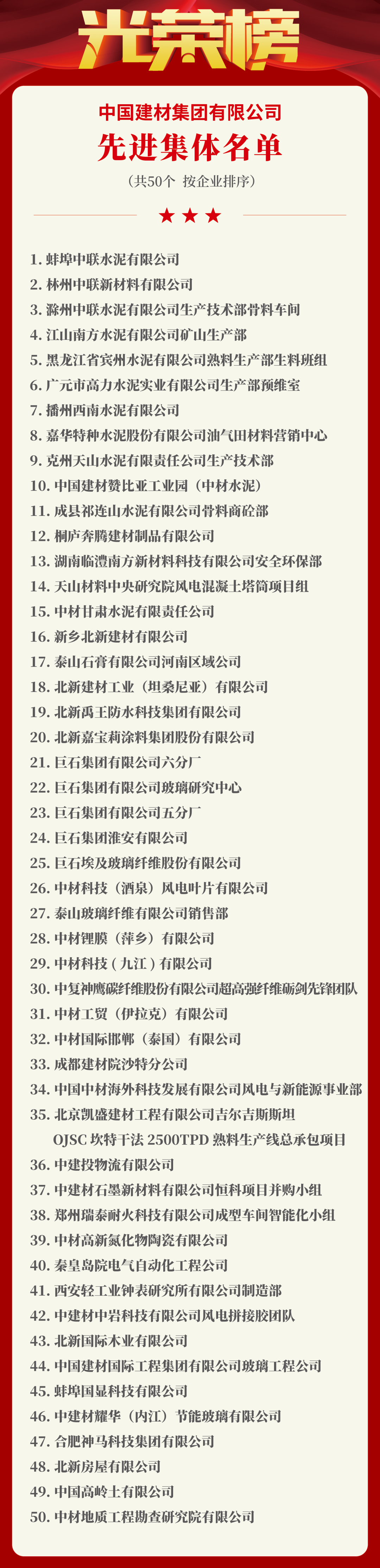 4月28日,中國建材集團在京召開2025年勞動模范和先進集體表彰暨典型事跡宣講會。集團黨委書記、董事長周育先出席會議并講話,集團黨委常委、紀委書記劉磊宣讀表彰通報和決定。中國機械冶金建材工會副主席張杰出席會議。 為表彰先進,樹立典型,大力弘揚勞模精神、勞動精神、工匠精神,進一步激勵廣大干部職工在集團高質量發展中建功立業,集團工會決定,授予舒青松等30人“中國建材集團勞動模范”榮譽稱號,授予蚌埠中聯水泥有限公司等50個基層單位“中國建材集團先進集體”榮譽稱號。會上,對劉少兵、孫元成、李偉、陳秋飛、趙小梅、郭清以等6名榮獲“全國勞動模范”的同志予以通報表彰,向集團勞動模范和先進集體代表頒發獎章、證書和獎牌。 周育先指出,今年是中華全國總工會成立100周年,黨中央、國務院召開大會,表彰一批全國勞動模范和先進工作者,習近平總書記出席大會并作重要講話,要深入學習貫徹落實習近平總書記關于工人階級和工會工作,關于勞模精神、勞動精神、工匠精神的重要講話精神,緊緊依靠工人階級和廣大勞動群眾,進一步激勵集團廣大干部職工愛崗敬業、銳意創新、勇于擔當、無私奉獻,為集團高質量發展作出更大貢獻。 在“五一”國際勞動節到來之際,周育先代表集團黨委,向受到表彰的全國勞動模范、集團勞動模范和先進集體表示熱烈祝賀,向奮斗在集團各個戰線上的廣大干部職工以及家屬親屬致以誠摯的節日問候。他講到,受表彰的勞動模范和先進集體,要一如既往保持優良作風,持續發揮示范引領作用,始終站在時代前列,為集團廣大干部職工樹立拼搏奮斗的榜樣,為集團高質量發展再創佳績;廣大干部職工要向勞模榜樣學習,主動對標先進、努力爭當先進,以實際行動為加快建設世界一流材料產業投資集團作出更大貢獻。 周育先強調,黨的二十屆三中全會對新的歷史起點上進一步全面深化改革、推進中國式現代化作出總動員、總部署。當前集團正處在改革發展關鍵期,各級企業工會要把廣大干部職工組織動員起來,以實干實績推動集團高質量發展不斷開創新局面。一是大力弘揚勞模精神、勞動精神、工匠精神,凝聚企業高質量發展的澎湃動力。二是建設高素質的職工隊伍,堅決扛起央企使命擔當。三是深化產業工人隊伍建設改革,不斷激發創新創造活力。四是夯實工會組織建設根基,提升服務大局的價值創造能力。五是切實維護好、發展好勞動者權益,提升職工群眾幸福感。 在典型事跡宣講會上,趙小梅、孫元成、高萌、林東、吳升財、楊青松等6位代表先后作事跡宣講,用樸實的語言、成長的故事、感人的事跡詮釋了勞模精神、勞動精神、工匠精神的內涵,展現了愛崗敬業、勇于創新、甘于奉獻、爭創一流的勞動模范和先進集體的風采。參會人員紛紛表示,事跡感人至深,勞動創造價值,要向受表彰的勞動模范和先進集體學習,以實際行動在集團全面深化改革、加快建設世界一流材料產業投資集團中創佳績、作表率。 會前,周育先、張杰、劉磊與參加慶祝中華全國總工會成立100周年暨全國勞動模范和先進工作者表彰大會的全國勞動模范以及集團勞模代表親切交流。全國勞動模范、集團勞動模范和先進集體代表一行還集體參觀了集團展廳。 集團和股份公司在京二級企業黨委主要負責同志、工會主席、黨群工作部部長、國海辦公區職工代表共105人在主會場參會。各成員企業黨組織書記、副書記、工會主席、黨群工作部負責同志、黨群工會骨干、職工群眾代表共3200多人在738個分會場參會。